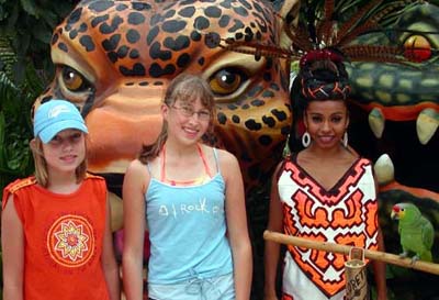 Costa Maya, Meksiko, Jukatanin niemimaa. Emma ja Jenni kuvassa Maya intiaaniedusnaisen kanssa, jotka ovat pienikokoisia, vrt pituus