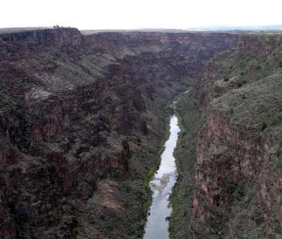 Vasemmalla Rio Grande joen laakso syvässä rotkossa