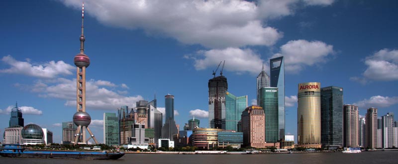28.9.2008 poikkeuksellisen hienoja ilmoja Shanghaissa, kirkkaat poutapilvitaivaat, lämpöä 27 astetta. Ylhäällä Shanghain valokuvatuin maisema