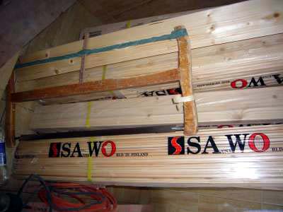 Yllä kaakeloitu suikuhuone ja saunaan tarvittava puutavara,
