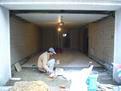 mallin mukainen pokasaha. Oikealla laatoitetaan autotallin lattiaa